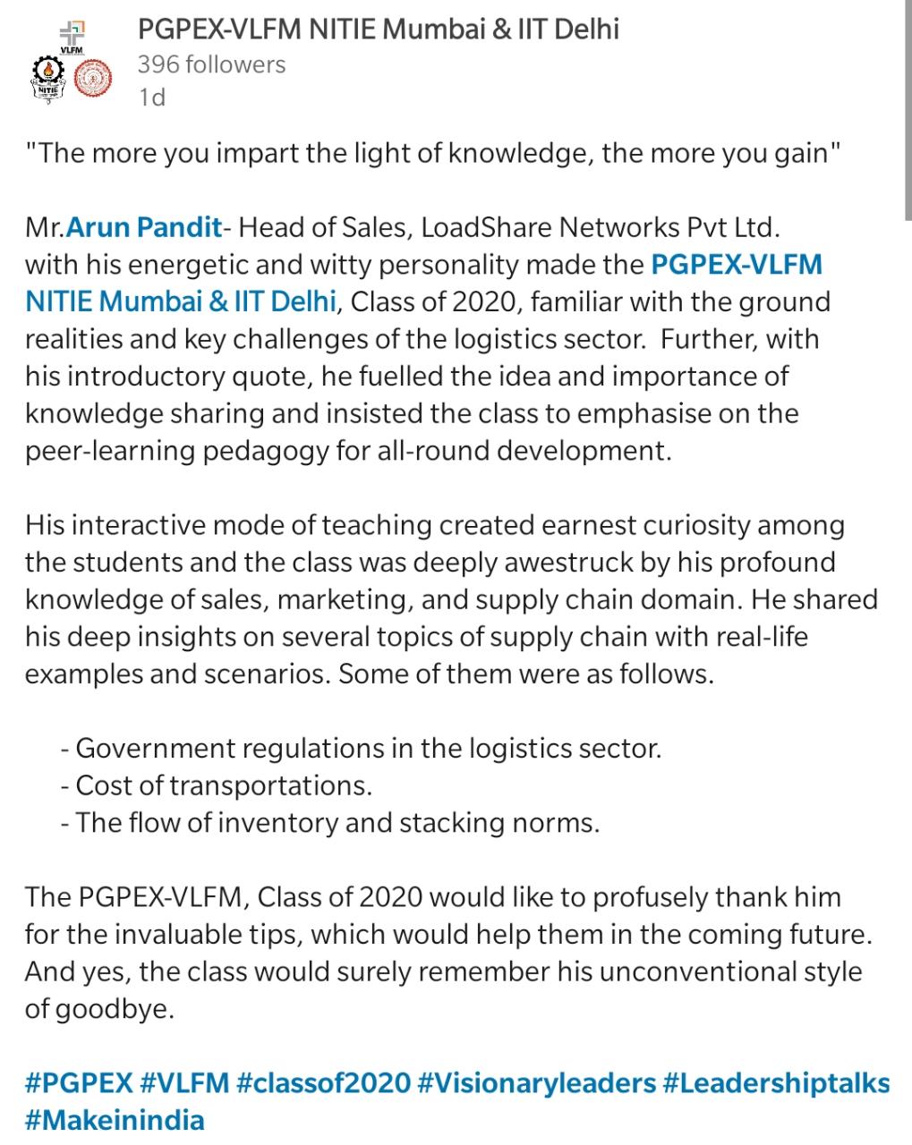 Thank you PGPEX-VLFM NITIE Mumbai & IIT Delhi for inviting me as the first speaker of Drona – The leadership talk series for the new batch at National Institute of Industrial Engineering, Mumbai. It was an amazing experience interacting with a room full of extraordinary people with such a rich and varied experience . I tried my best to open your mind to the on ground realities and share vital lessons from my limited experience of Logistics and supply chain. It would compel you to ask the right questions and hopefully develop frameworks to solve some of the most pressing problems in Supply Chain. And Thank you for bearing with me for 4 hours and ofcourse the Redbull!