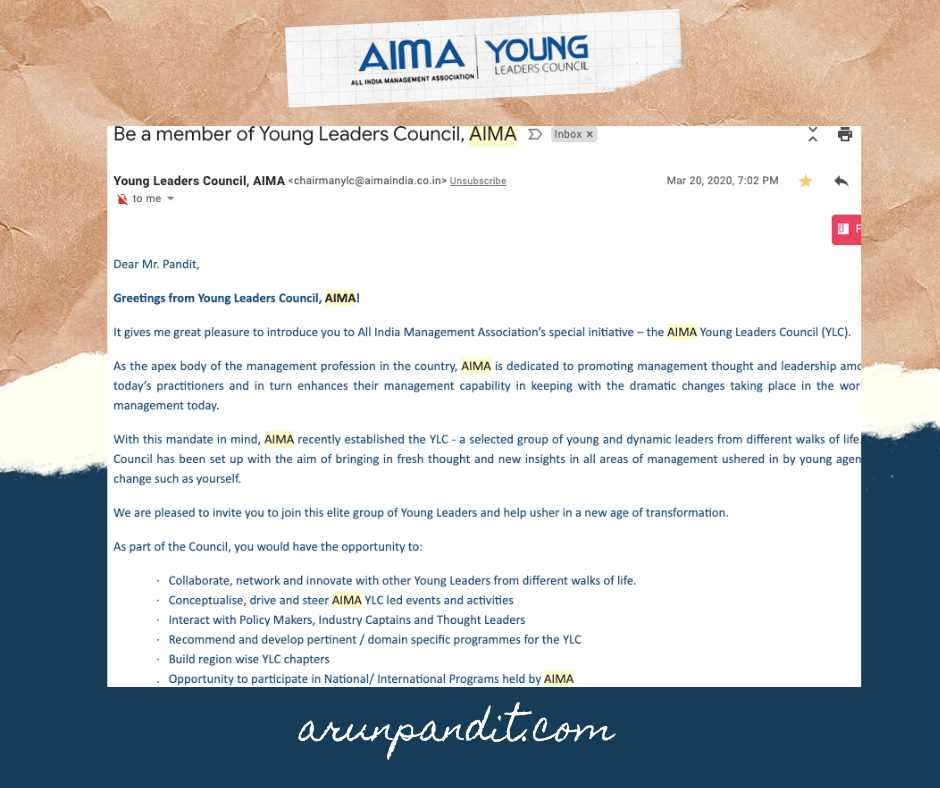 Arun Pandit Invited to be a Member of the Young Leaders Council ( Y.L.C.) by A.I.M.A.